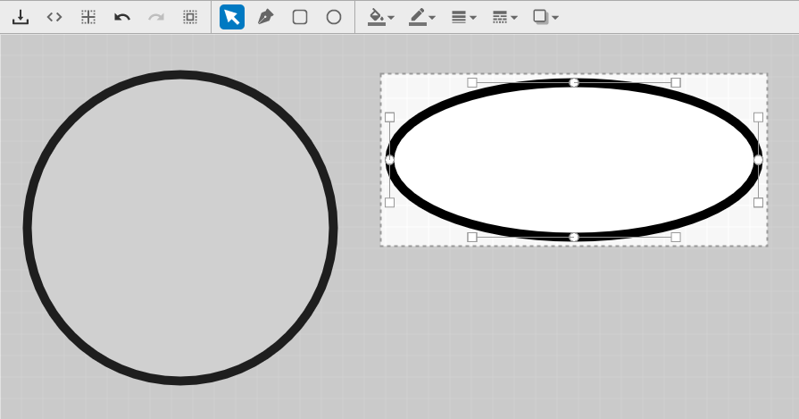 When a shape is selected, a bounding box appears around the shape that can be manipulated to change the size and proportions of the selection. You can resize in increments with the grid, or smoothly without. Resizing shapes maintains their proportions when you hold either the Ctrl or Shift keys.