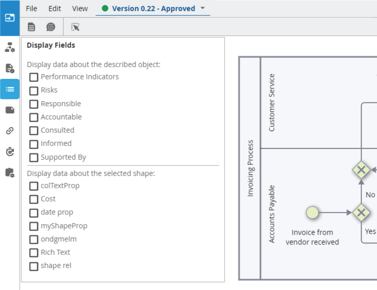 Authors can now included Diagram Element Custom Properties in their diagrams, care of the Display Fields panel.