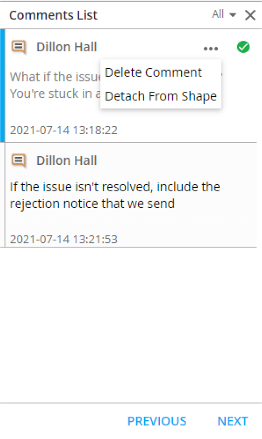 New to the Cloud, for both Web and IGX diagrams, is comment resolution. After a comment has been addressed, and the suggested edits complete, users with permission to do so may resolve those comments. In the Comment List you can see a list of comments that are pending and resolved. If a comment is mistakenly resolved, deleted, or unresolved, users who own or watch the diagram and the original commenter will receive new email notifications. This helps users keep track of the conversation surrounding a diagram. Deletion is still an option, now located in the "..." popup.