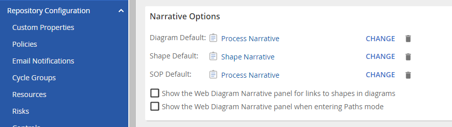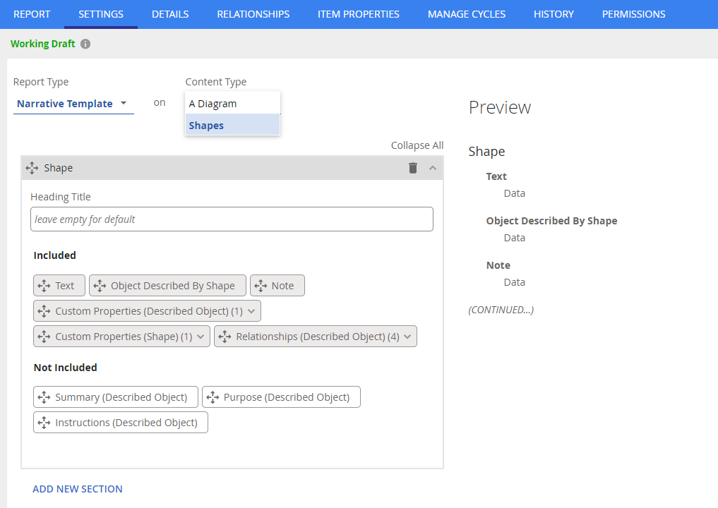 Narrative Template reports can now be created for shape content. Previewing a Shape narrative template will take you to the selected diagram with the Narrative panel expanded. This preview allows you to select shapes and test your new report.