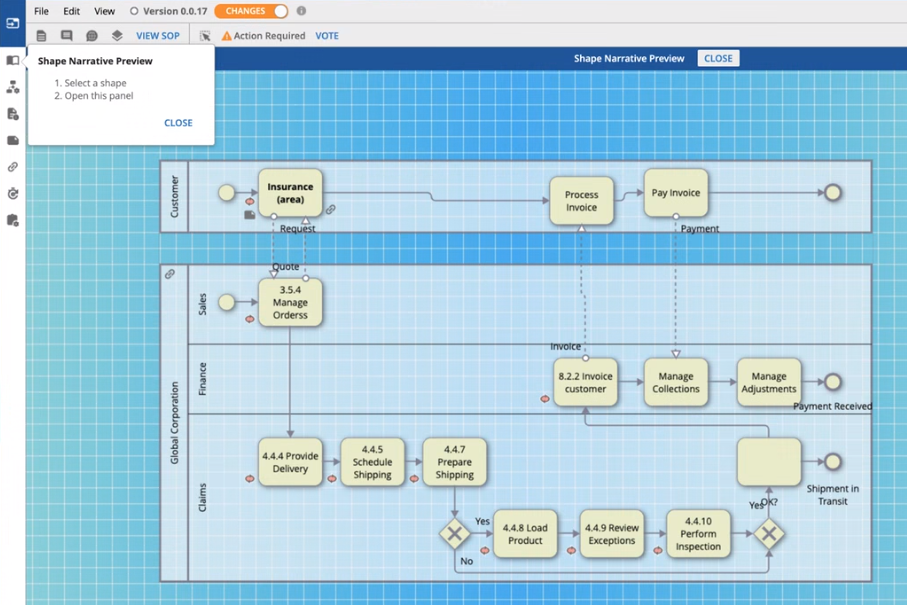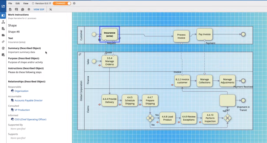 Also new to the diagramming area is the Narrative Panel. Similar in function to the View SOP button, but especially useful for reviewing shape-level data. Simply select a shape you would like to review, open the Narrative Panel, and see everything that it has to offer. Selecting other shapes refreshes the panel so you can easily review the various steps in a process.