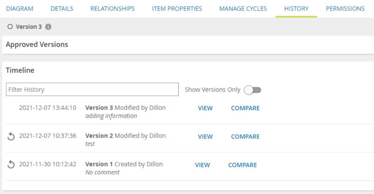 Object history now includes the details of custom property changes. Diagram history data is optimized for approval and review workflows. When voting you can now enter the compare view, adjust filters, and quickly see what has changed between the proposed and previous approved version. Version comparisons now default to the full compare mode with changes outlined in the grid.