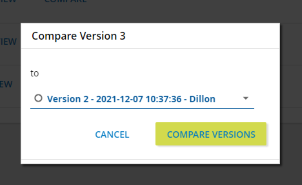 Double-check the version you would like to compare in the Compare dialog, then click COMPARE VERSIONS