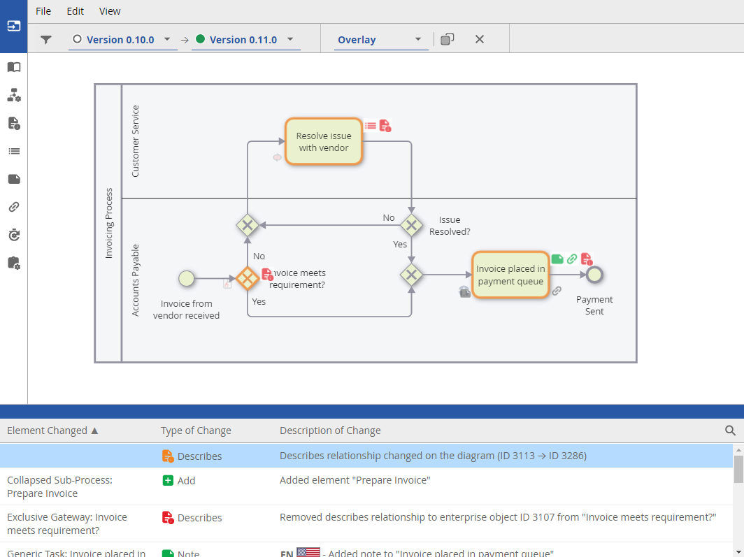 Object history now includes the details of custom property changes and now includes summary, purpose and instruction changes. Version comparisons now default to full compare mode with changes outlined in the grid and additional filtering options.