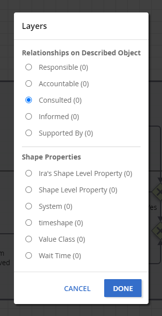 The Layers modal now offers Described Object RACI options to expose, support for Custom Properties with multiple lines of text and Rich Text elements, and consolidated entires for hidden and deleted custom property Relationships.