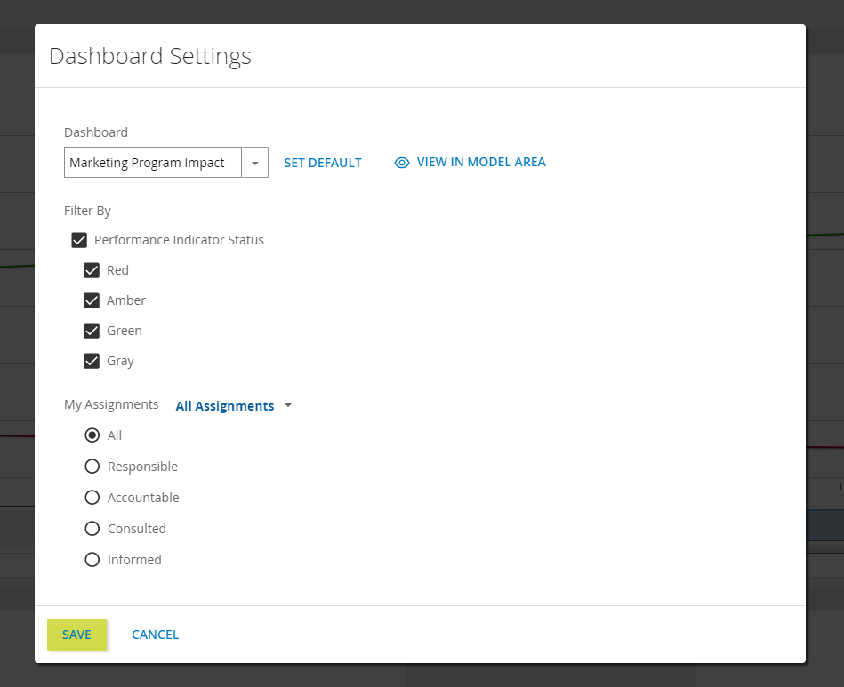 Filter By: performance indicator filters that behave the same as before. Clicking the filter icon in the Dashboard area will toggle these settings.