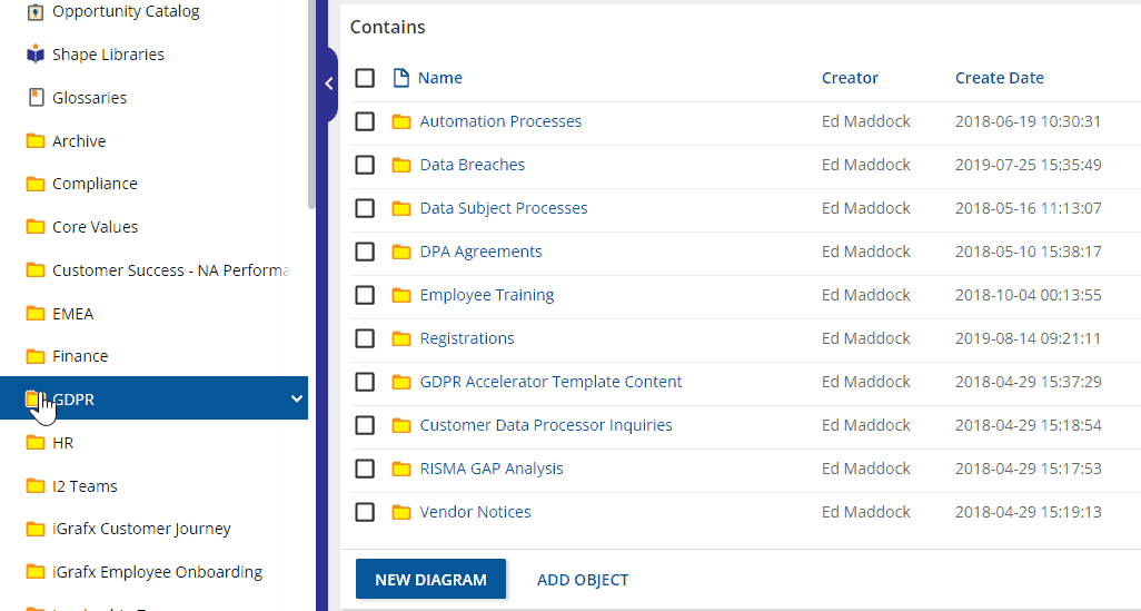 Select multiple objects for editing in the Contains area of Model Tree Folders and Enterprise Objects.
