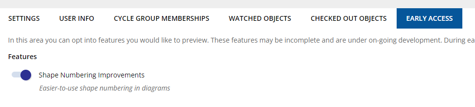 The Shape Numbering Improvements feature flag can be toggled in the Profile area, as well as in the Administration area