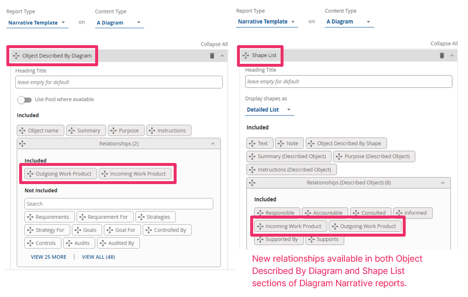 The relationship "Work Product Flow" is now available as an option in both the Described Object and Shape List sections in your Narrative reports! With this addition to Relationships, we can now show what triggers processes and what they produce. Process owners and performers can now include inputs and outputs for any activities described by diagrams and their shapes in their narrative reports.