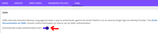 iGrafx Platform allows configuration of auto-creation of authenticated ADFS users in the iGrafx Platform. The following information and instructions pertain to SAML2 with ADFS. However, they can be used with modifications to do the same for other IDP's.