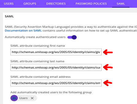 Go to the iGrafx Platform – Administration – User Management – SAML tab and enter the rule language URLs as shown here.