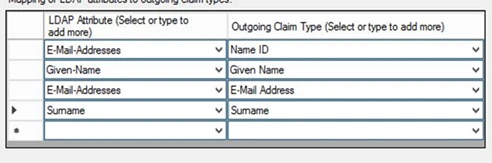 - Enter the following in the ADFS Edit Rule LDAP Attribute tab