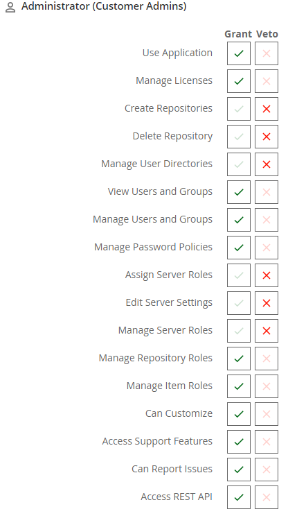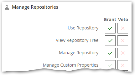If you assign repository roles to the same user or group, and those roles have conflicting Grant and Veto settings for the same permission, the Veto setting will be the one in effect.