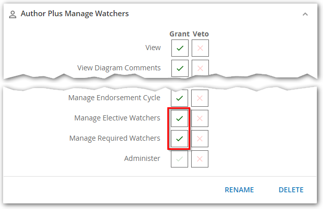 For example, for a new "Author Plus Manage Watchers" role, two additional permissions (highlighted below) are granted that are not granted to the default "Author" item role: