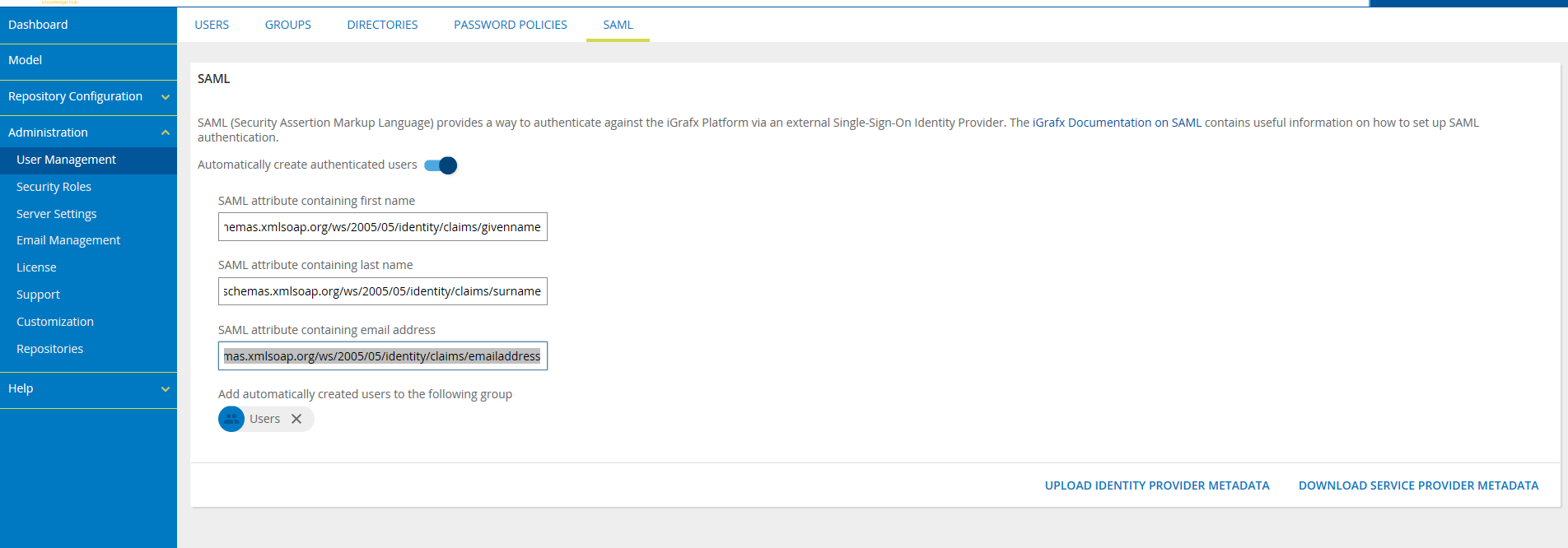 - Logged in as an Administrator, go to the Administration-User Management- SAML tab.