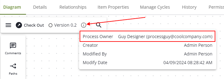 - If a user has been assigned as a process owner, it will become available in the diagram's info popup as well.