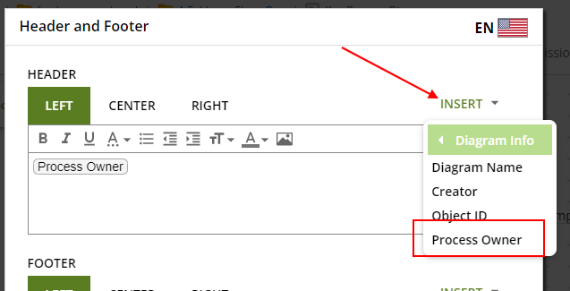 - Diagram headers/footers also have a tag for displaying the process owner.