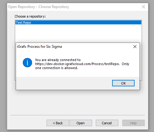 When trying to connect to/open the repository in the Desktop Client, you receive a message "You are already connected to..." but you cannot see or access the repository tree.