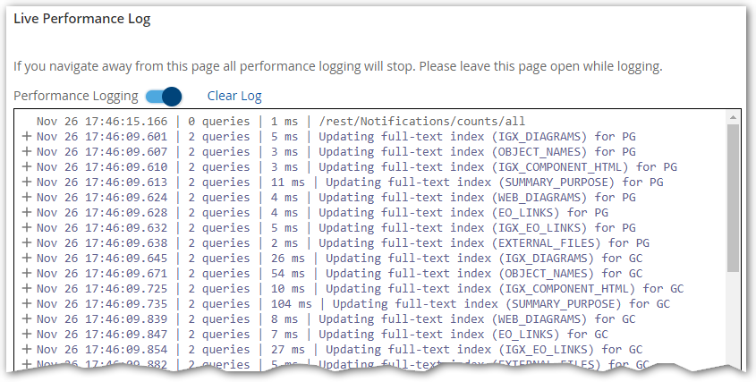 In case users notice a lag in server response for some tasks, the iGrafx platform provides a page for live performance logging to help determine where performance bottlenecks are occurring.