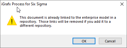 When adding an IGX file to your repository, or when working with multiple repositories, you might get a warning stating that "This document is already linked to the enterprise model in a repository".