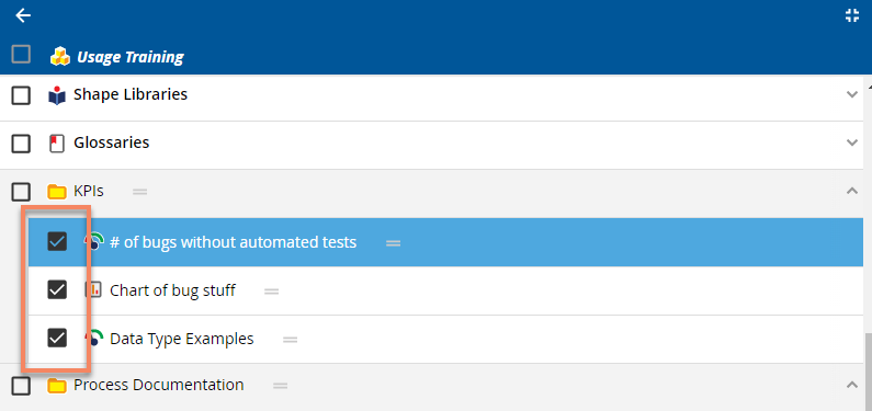 Often times a user will want to move multiple objects to a new location, or delete a selection of objects from more than one folder. The iGrafx Platform provides the full screen tree view for certain types of batch operations to achieve this.