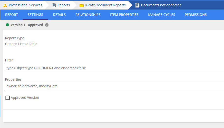 Filter,PropertiesandApproved VersioncheckboxCODE{"filters":"type=ObjectType.DOCUMENT and endorsed=false","properties":"owner, folderName, modifyDate","version":"LATEST"}Make sure to escape double-quotes in the filter with a backslash (i.e.