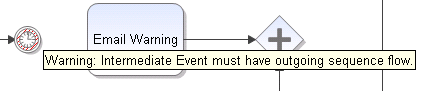 Delete the line between the Timer event and Email Warning. The Timer indicates a design problem with shaded red lines.