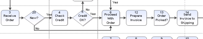 Connector lines are automatically created with decision case labels on decision shapes. By default, the first line drawn from a diamond is labeled No and the second is Yes. You can define your own label text.
