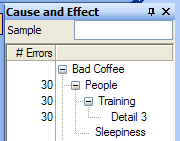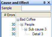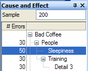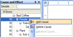 This procedure updates the number of errors for a subcause you've added. Errors appear in the Errors column of the Cause and Effect window. Updates in the Cause and Effect window also appear in the CE diagram.