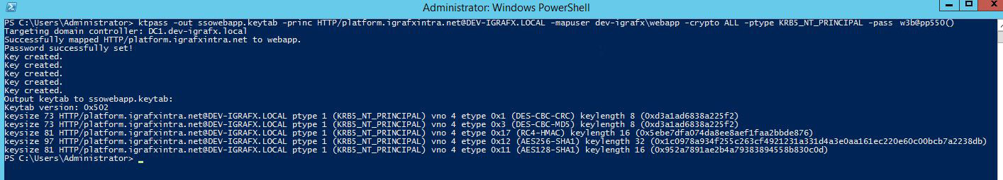 C:\> ktpass -out ssowebapp.keytab -princ HTTP/platform.igrafxintra.net@DEV-IGRAFX.LOCAL -mapuser dev-igrafx\webapp -crypto ALL -ptype KRB5_NT_PRINCIPAL -pass w3b@pp550()
