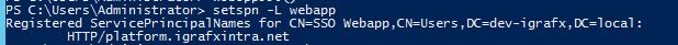 You can verify if the principal was correctly mapped by calling setspn -L webapp (substitute "webapp" with the proper user logon name, as created above in section Create User)