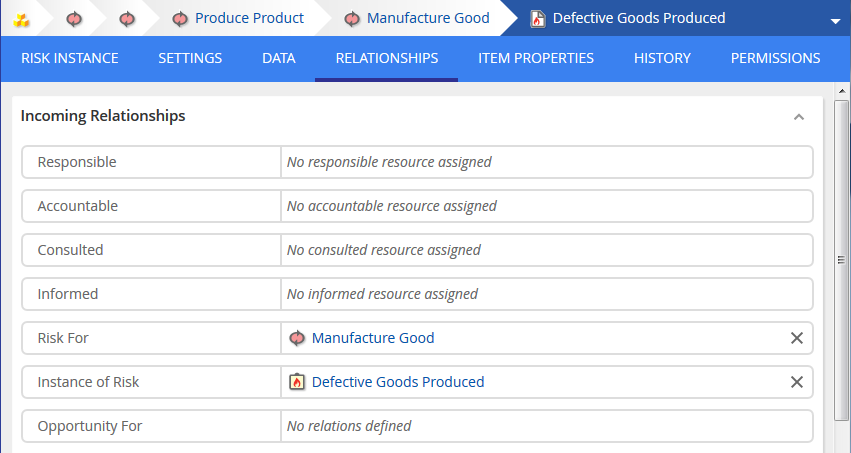 - If you create a Risk Instance as a child of a non-Risk repository object, then a Risk For relationship is automatically created to the object you created the Risk Instance under. The relation can be changed during object creation afterwards in the RELATIONSHIPS tab. You can add a relationship to a Risk from the Risk Catalog while creating the Risk Instance.