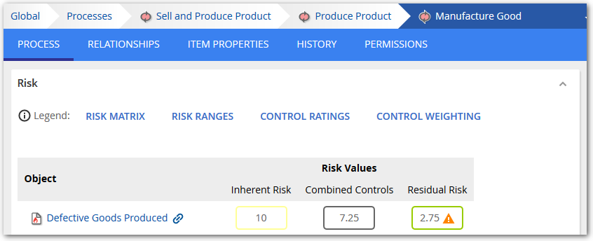 In the screenshot example below, the Risk Instance "Defective Goods Produced", has a "Risk For" relationship to the "Manufacture Good" Process which documents the risk of defective goods being produced by the "Manufacture Good" process: