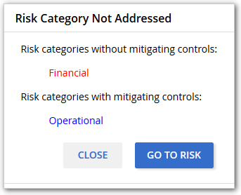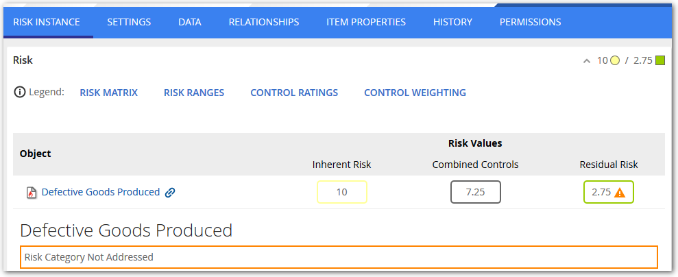 A Risk or Risk instance can have multiple categories. The available options are the same for Risk, Risk Instance, Control and Control Instance objects. The purpose of this categorization is to make sure that mitigating controls overlap all categories a risk is assigned to. If they don't match, then a warning indicator is displayed on the object main tab or on the risk summary of the object the risk is assigned to.