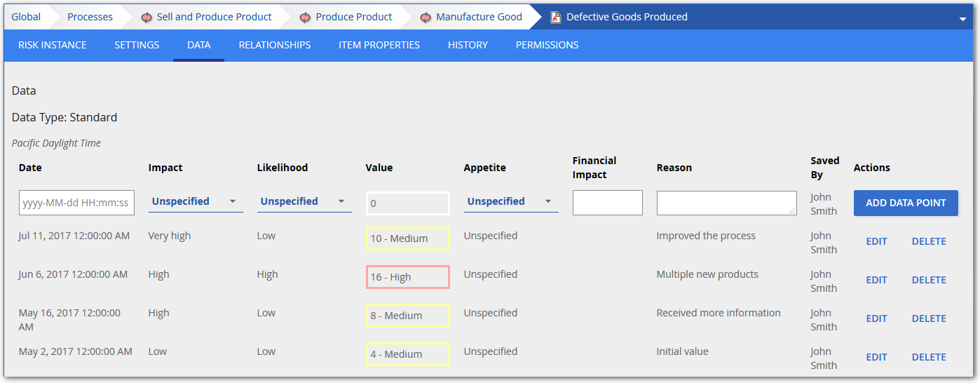 Risk Data Points added with Date values in the future of the current date are not displayed on this tab. Only the most recent historical data is displayed. The basic math on this page is: