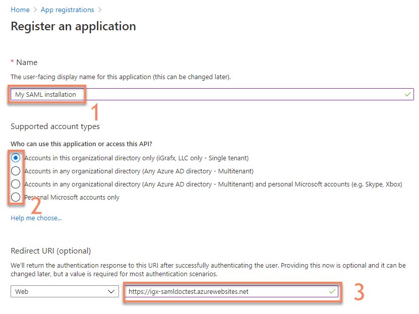 Enter a name for your application registration that allows you to identify it (1), select the account types that can log in (2) and enter the HTTPS URL under which your installation will be available (3). Then press