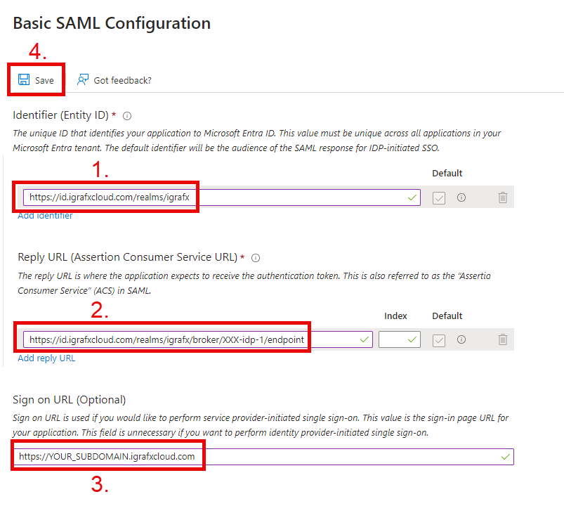 ACS/Reply URL:https://id.igrafxcloud.com/realms/igrafx/broker/YourTenant-idp-1/endpointSign on URL: