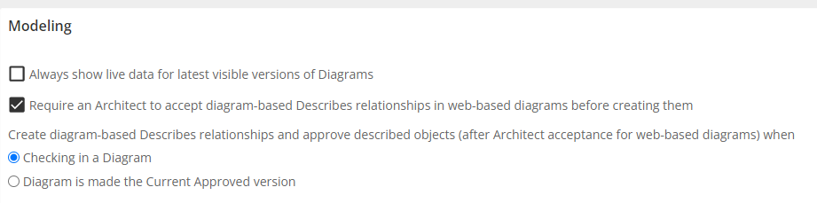 Furthermore, in 17.4 and later, for Web diagrams, the Administrator can now dictate that in addition to requiring Architect acceptance of describes relationships to newly proposed objects, that Describes relationships to existing objects also require Architect acceptance. Both of these options, give you more control over the introduction of new relationships in the repository. For example, you might not want changes to work-in-progress diagrams to affect enterprise objects.