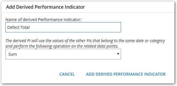 Derived Performance Indicators are created by performing a statistical operation (Sum, Average, Max, Min, or Median) on the data from the PIs in the Table object. A derived Performance Indicator will use the values of the other Performance Indicators having the same date or category and perform the specified operation on the related data points.