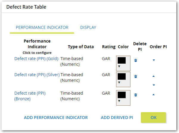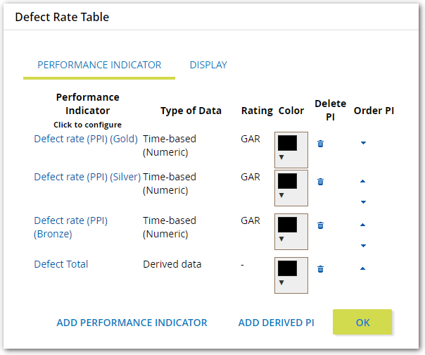 - The Order PI column contains arrow icons you can click to change the order of the Performance Indicators in the table.