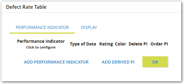 - In the Performance Indicator column, you can click a link for each component Performance Indicator or Derived PI to access additional configuration tabs that affect how its data is calculated and displayed. For more information on configuring Performance Indicators for Table Objects, see Configure Performance Indicators in a Table Object.