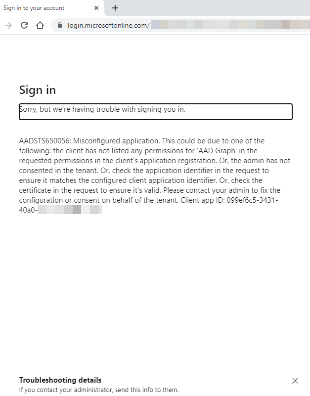 | Misconfigured application. This could be due to one of the following: the client has not listed any permissions for AAD Graph in the requested permissions in the client's application registration. Or, the admin has not consented in the tenant. Or, check the application identifier in the request to ensure it matches the configured client application identifier. Or, check the certificate in the request to ensure it's valid. Please contact your admin to fix the configuration or consent on behalf of the tenant. Client app ID |