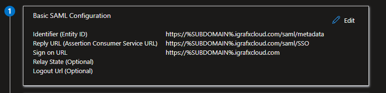 After navigating to the Basic SAML Configuration section, ensure the three items look as follows, including the https:// protocol prefix as well as the correct capitalization, and replacing %SUBDOMAIN% with your iGrafx subdomain: