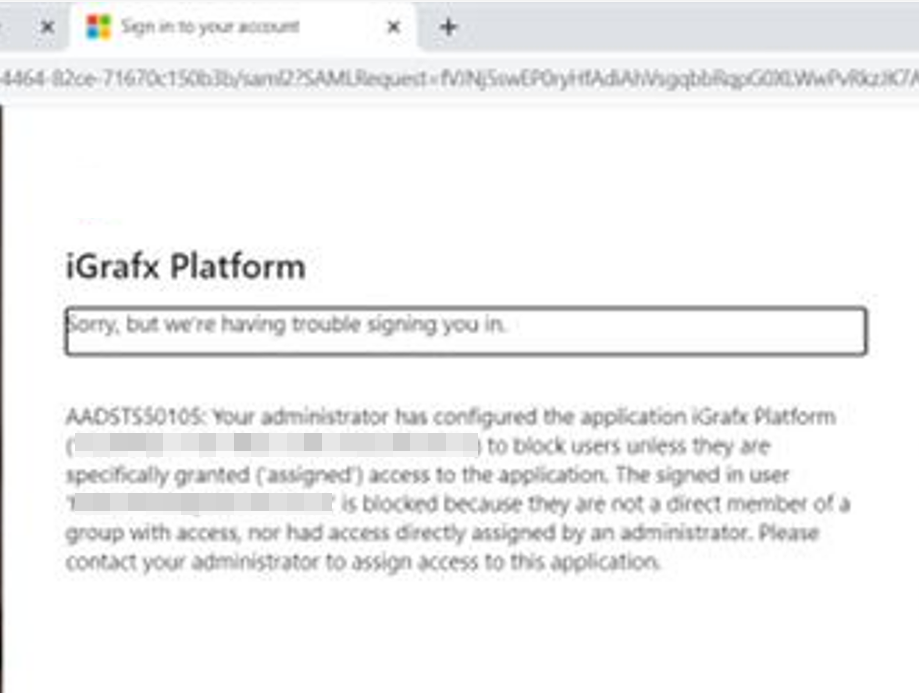 | Your administrator has configured the application iGrafx Platform to block users unless they are specifically granted ("assigned") access to the application. The signed in user "username" is blocked because they are not a direct member of a group with access, nor had access directly assigned by an administrator. Please contact your administrator to assign access to this application. |
