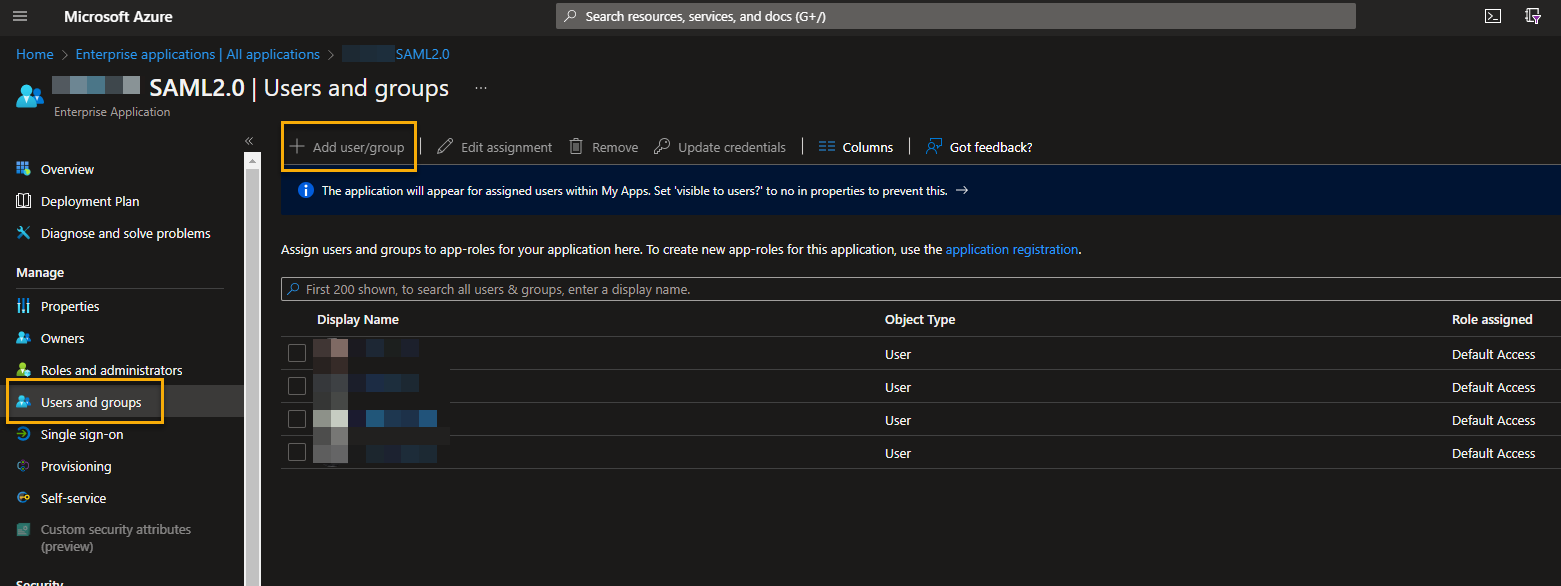 Open your iGrafx Azure Enterprise Application in your Azure Portal at https://portal.azure.com and go to the Users and Groups blade. On the respective blade, you will see the list of directly assigned users and list of user groups that have access to the application. Make sure the user is a member of at least one of the groups or is directly assigned access to the application by clicking the Ad user/group button at the top.