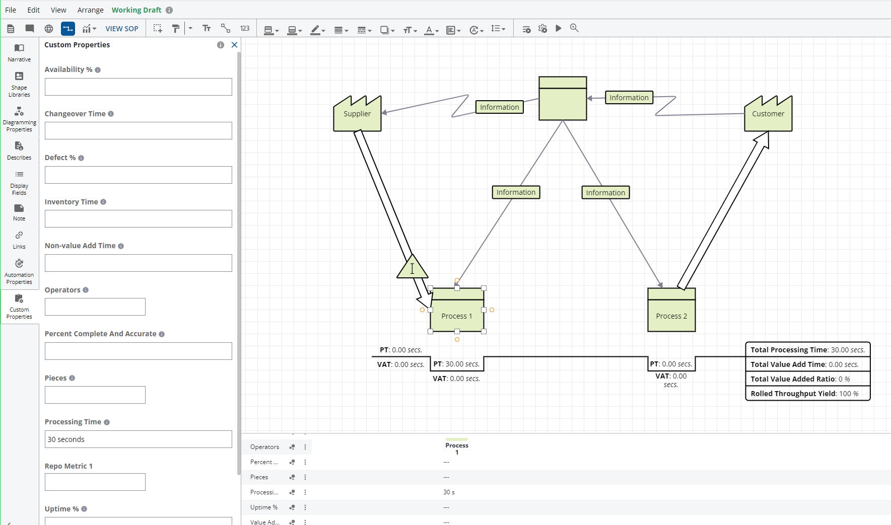 In the example above, Process 1 was selected, the custom properties panel was opened, and 30 seconds was entered into the Processing Time.