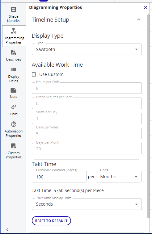 Note: If values are not showing up on the timeline despite having added values on the shape in the Custom Properties tab, check to make sure the property has the appropriate Lean Type specified. Custom Properties defined at the repository level (Repository Configuration → Custom Properties) do not currently support lean types. Diagram Defined Custom Properties are required to set a Lean Type.