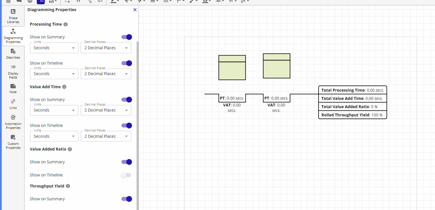 For both the diagram and shape level diagramming properties, the Processing Time and Total Value Add Time unit selections have an "auto" option, in addition to the normal range of milliseconds through years.