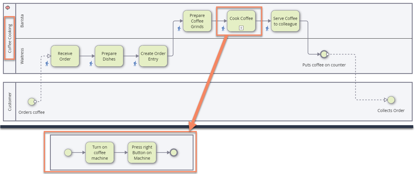 In this case, we might want to consider drawing a dedicated sub-process, that could explain in a more detailed way how the Barista and the assistant are working on actually making the coffee. The additional process diagram can then be referenced with a Call-Activity.